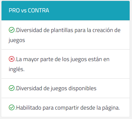 Tiene un repositorio amplio de juegos creados por otros usuarios a disposición de todos, reutilizables. Permite crear los propios para compartirlos con otros usuarios.